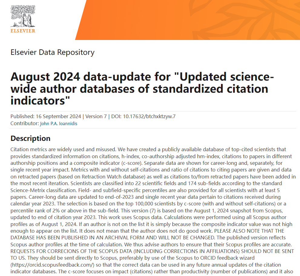 2024年9月16日,美国斯坦福大学(Stanford University)John P.A.Ioannidis教授团队发布全球前2%顶尖科学家榜单(World's Top 2% Scientists)。榜单分为关注整个学术生涯迄今影响力的“终身科学影响力榜单”,以及聚焦本年度学术成就的“年度科学影响力榜单”。