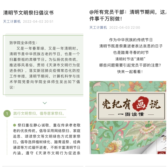 公司通过微信公众号推出了《清明节文明祭扫倡议书》,推送了《@所有党员干部:清明节期间,这件事千万别做》,号召全院师生共同携手,党员遵纪守法,做好示范带头,落实疫情防控要求,争做文明祭扫的践行者、移风易俗的推进者、文明殡葬的先行者、安全有序的维护者。