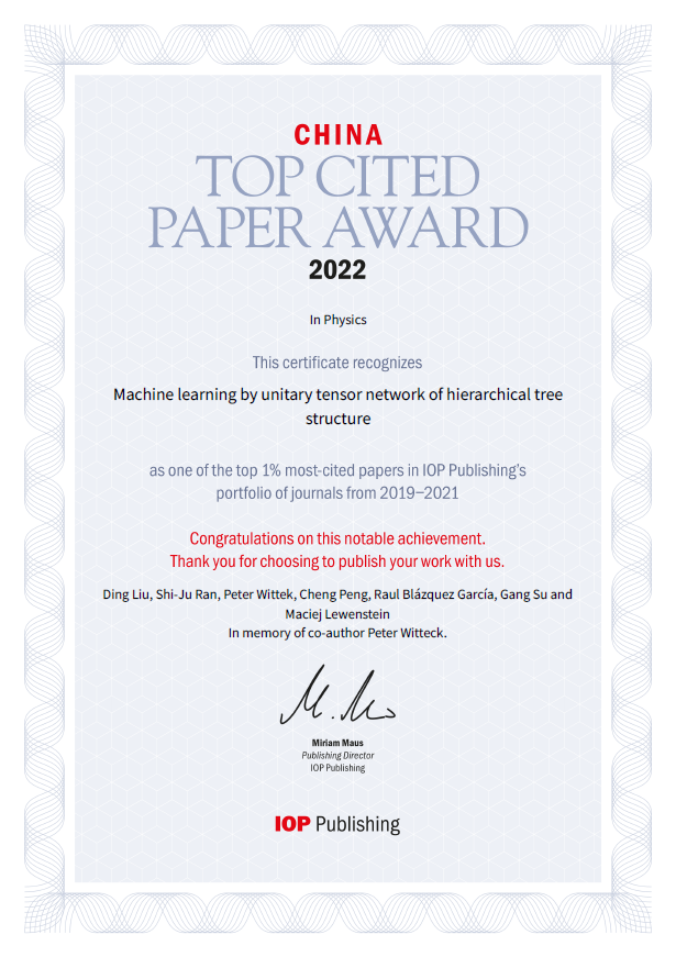 近日,公司青年教师刘丁为第一作者的研究论文Machine Learning by Unitary Tensor Network of Hierarchical Tree Structure获得英国物理学会出版社(Institute of Physics Publishing)颁发的2022高被引论文奖(Top Cited Paper Award 2022)。该奖项表彰英国物理学会旗下诸学术期刊所发表的在过去三年中被引数前百分之一(Top 1%)的优秀论文。