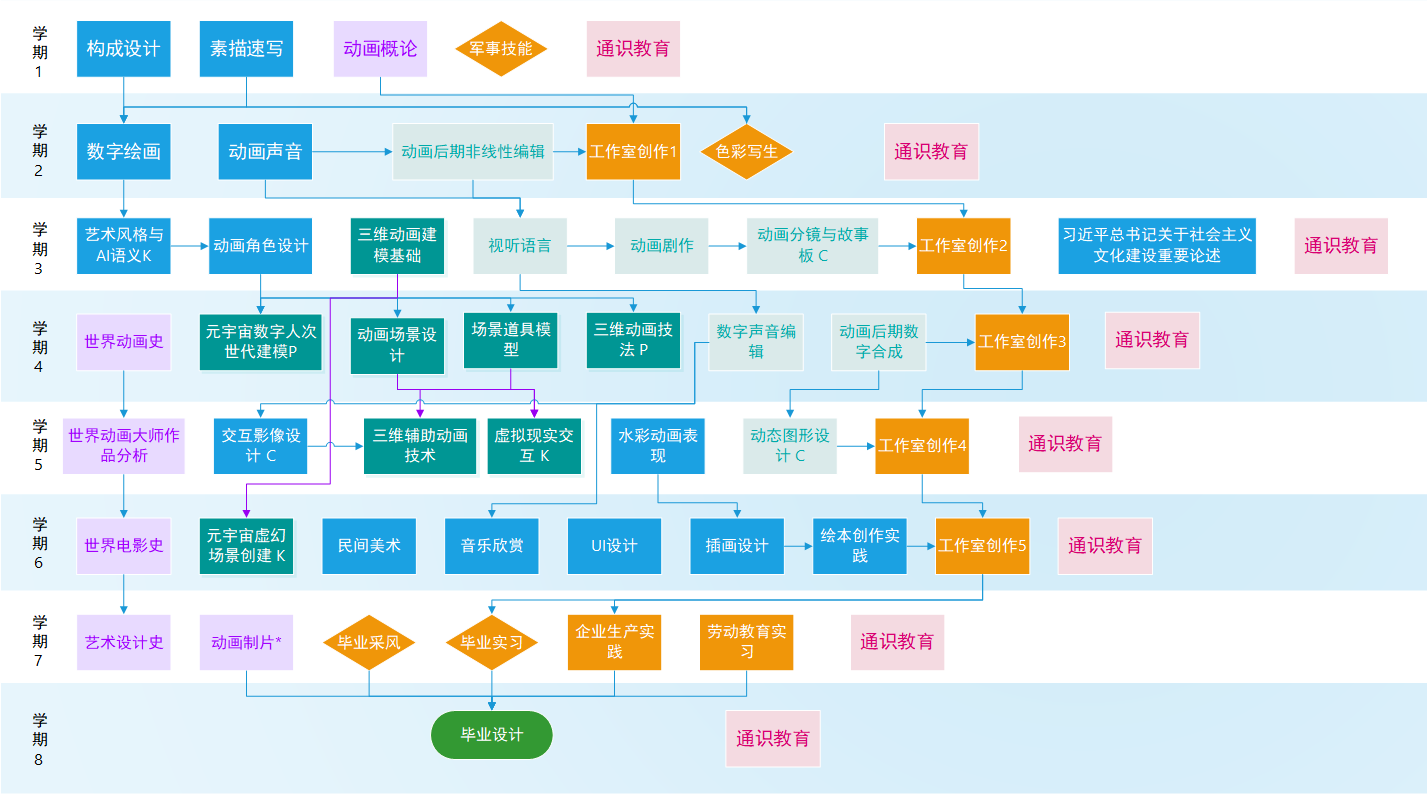 世界动画史、动画分镜与故事板、动画剧作、动画角色设计、动画场景设计、动画后期数字合成、三维动画建模基础、元宇宙数字人次世代建模、三维动画技法、交互影像设计、元宇宙虚幻场景创建、虚拟现实交互、数字声音编辑。