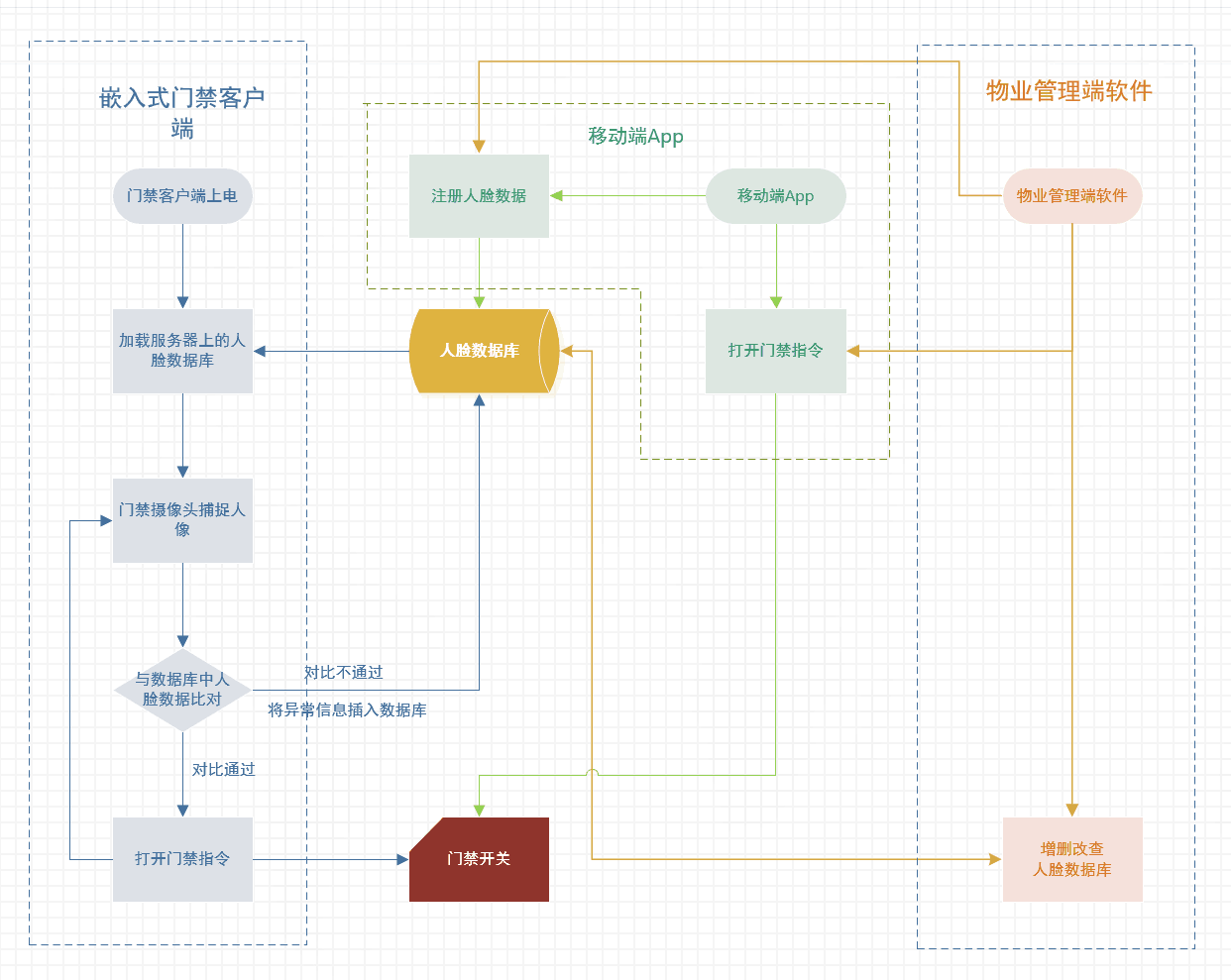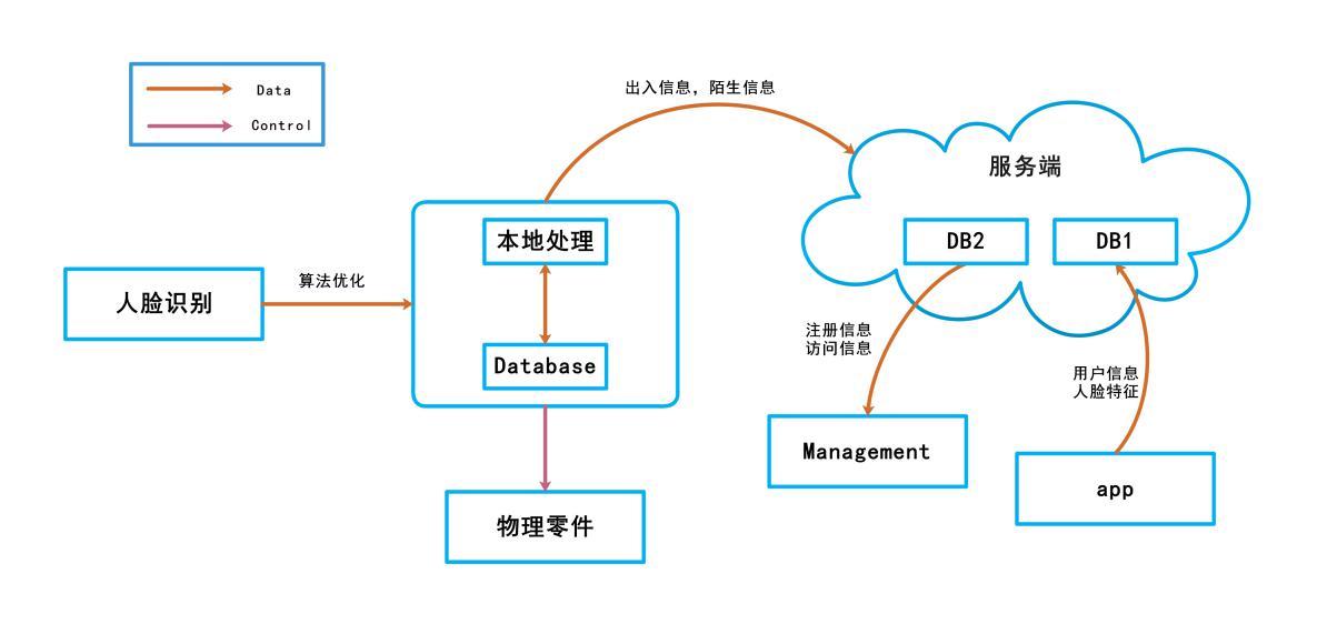 (4)云端服务器模块,将通过手机APP端和物业管理端注册的用户的信息以及其人脸特征存储在服务器中。 (5)用户客户端模块,主要用于用户的注册,以及管理员对门禁的操作功能。