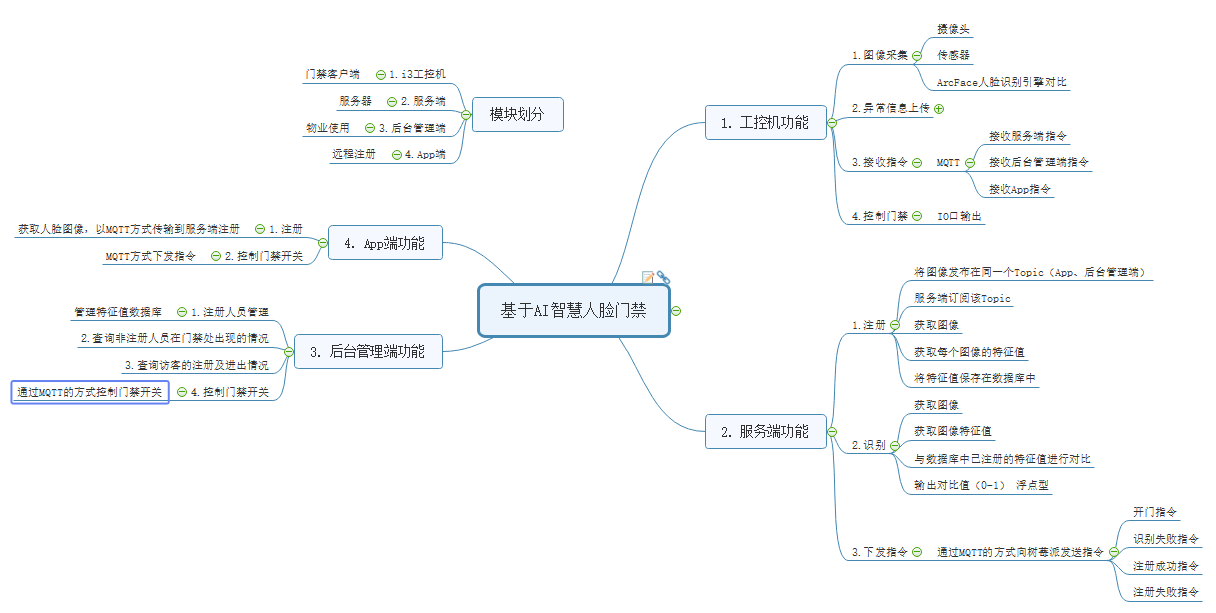 教 学 策 略 | 对系统进行模块划分,在组里指定员工分工完成工控机功能,服务端功能,后台管理功能,App端功能,并掌握虹软ArcFace SDK人脸识别引擎、利用RSA非对称加密算法、低功耗的嵌入式Linux开发板等开发技术。 对应的课前任务: 根据本组开发任务提前做好相关开发技术的准备工作,包括PyCharm、Qt、ArcFace SDK,Eclipse、IntelliJ,MySQL,Android Studio,TensorFlow等开发环境的搭建,开发语言和脚本的学习。 模块设计框图(如图1所示) 图1 人脸识别门禁系统框架图