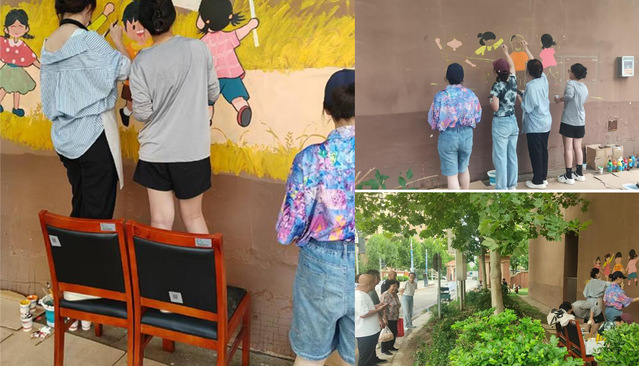活动当天,实践团成员们带着画笔和颜料早早奔赴社区,他们分工有序,或跪地描边、或踮脚涂色,汗水浸透衣衫仍笑意盈盈,将中华传统福字、童趣动物形象、生动游戏场景等元素融入作品,通过色彩装扮社区,助力“最美回家路”建设。活动期间,彩绘作品吸引居民驻足观赏,受到社区群众认可,成为社区环境美化与文化氛围提升的一处亮点。