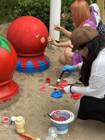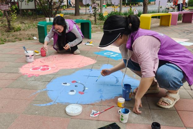 6月26日,“红色星火”实践团走进国兴家园社区,开展“为社区上色 让幸福升温”主题彩绘活动,与社区居民志愿者、东辉物业工作人员协同合作,在社区规划的石墩、墙面、地面进行彩绘创作。