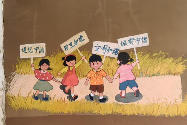 实践团围绕社区核心精神内核,以社区墙面为画布,用简洁明快的线条与和谐统一的色彩完成绘制。整幅作品紧扣文明建设主题,通过具象化的视觉语言传递社区倡导的正向理念,既贴合社区的人文氛围,又与周边环境自然融合。绘制结束后,原本单调的墙面成为社区的“文明法治宣传墙”,让文明公约在日常中浸润人心。